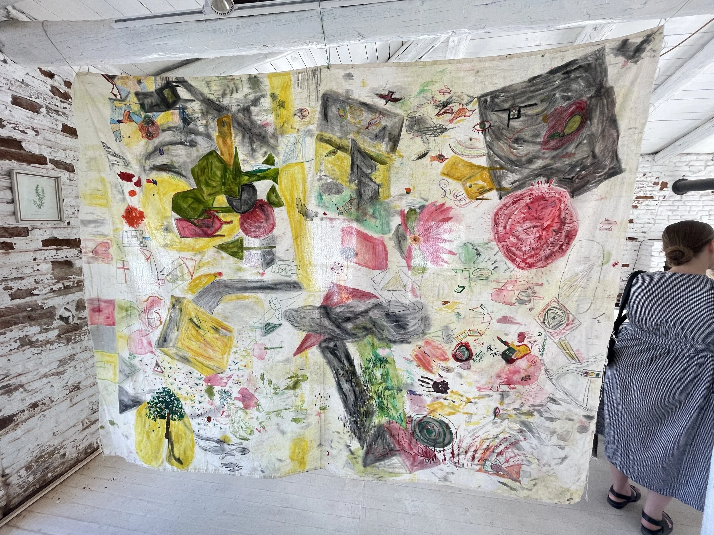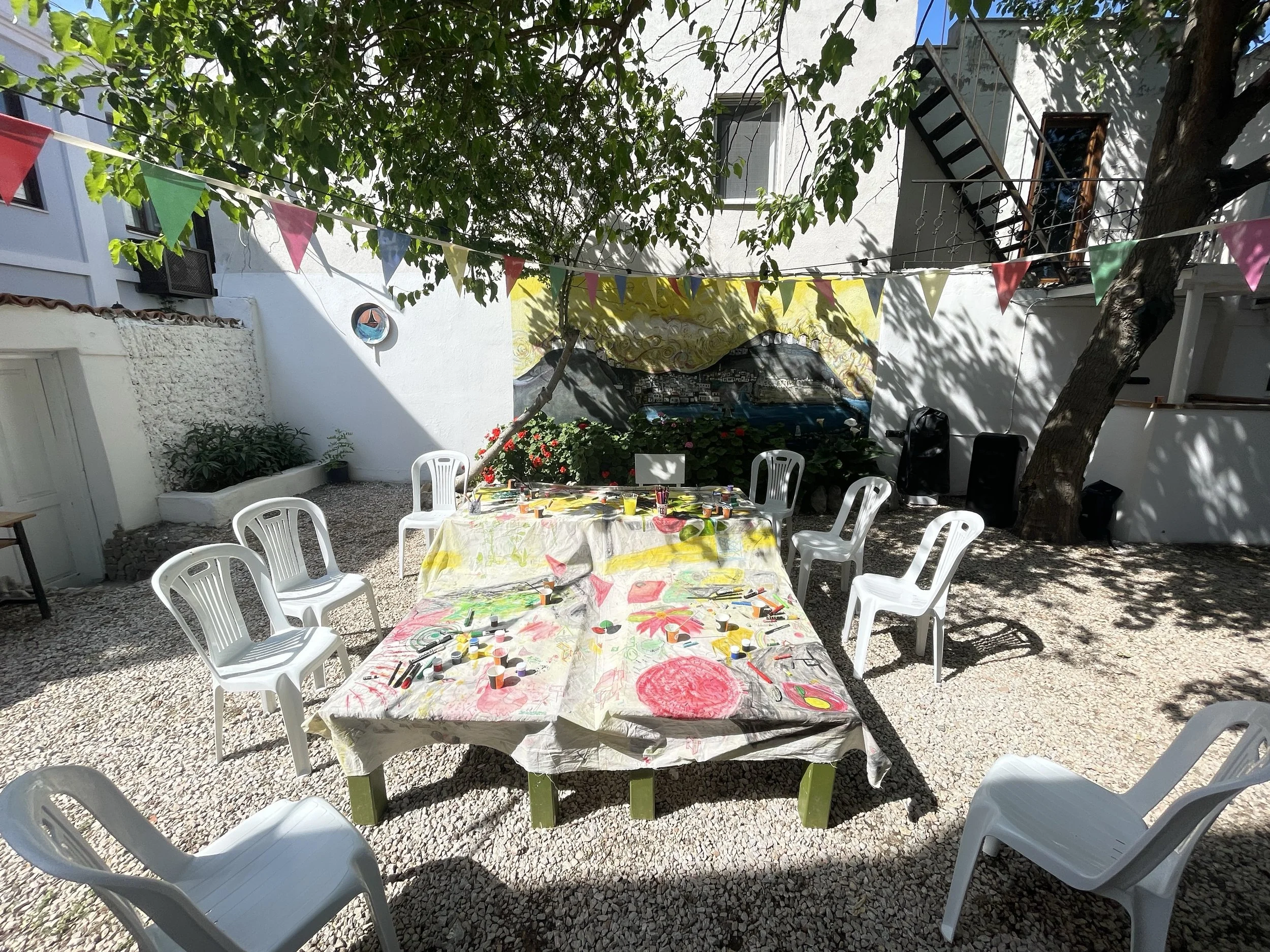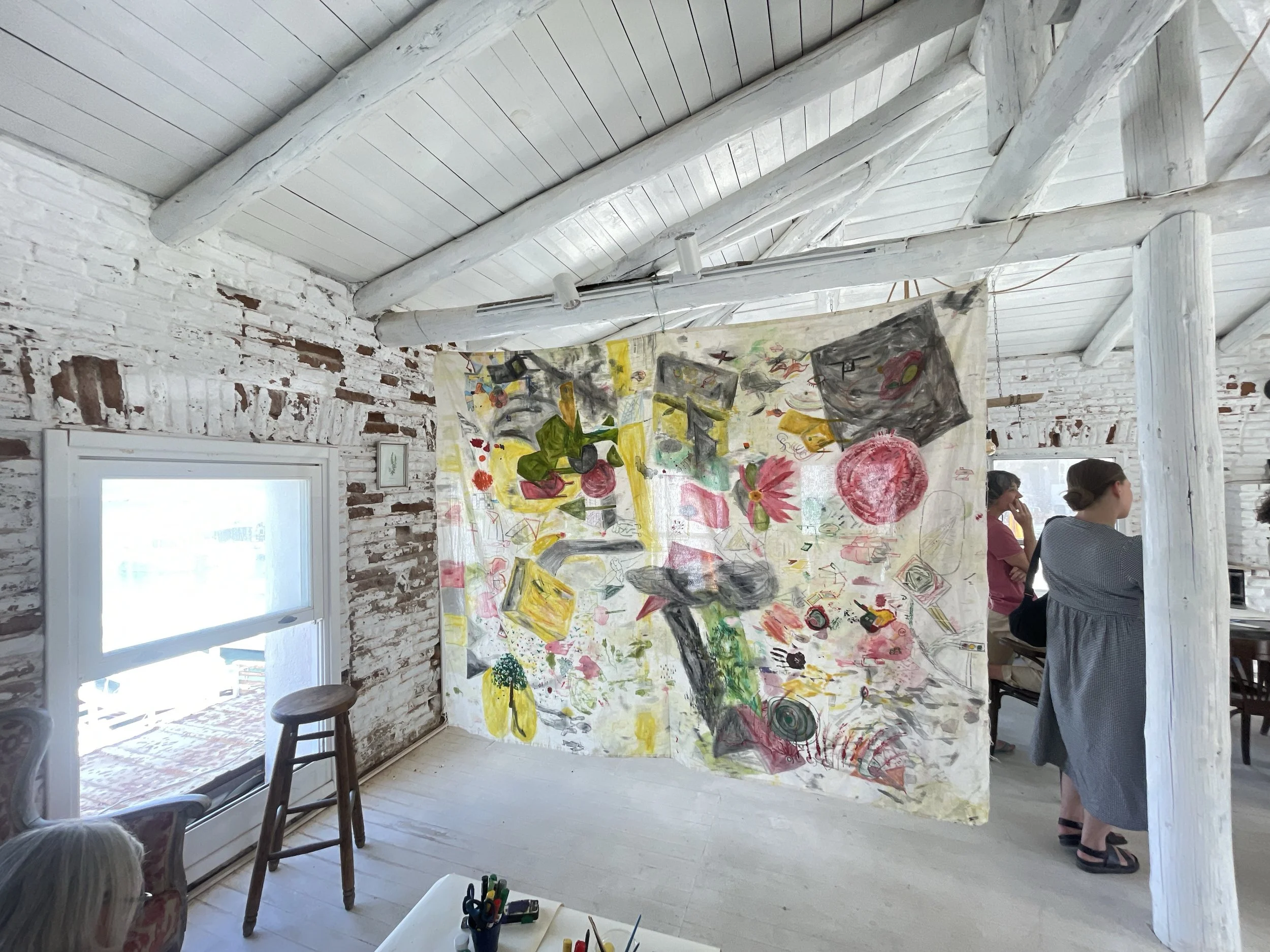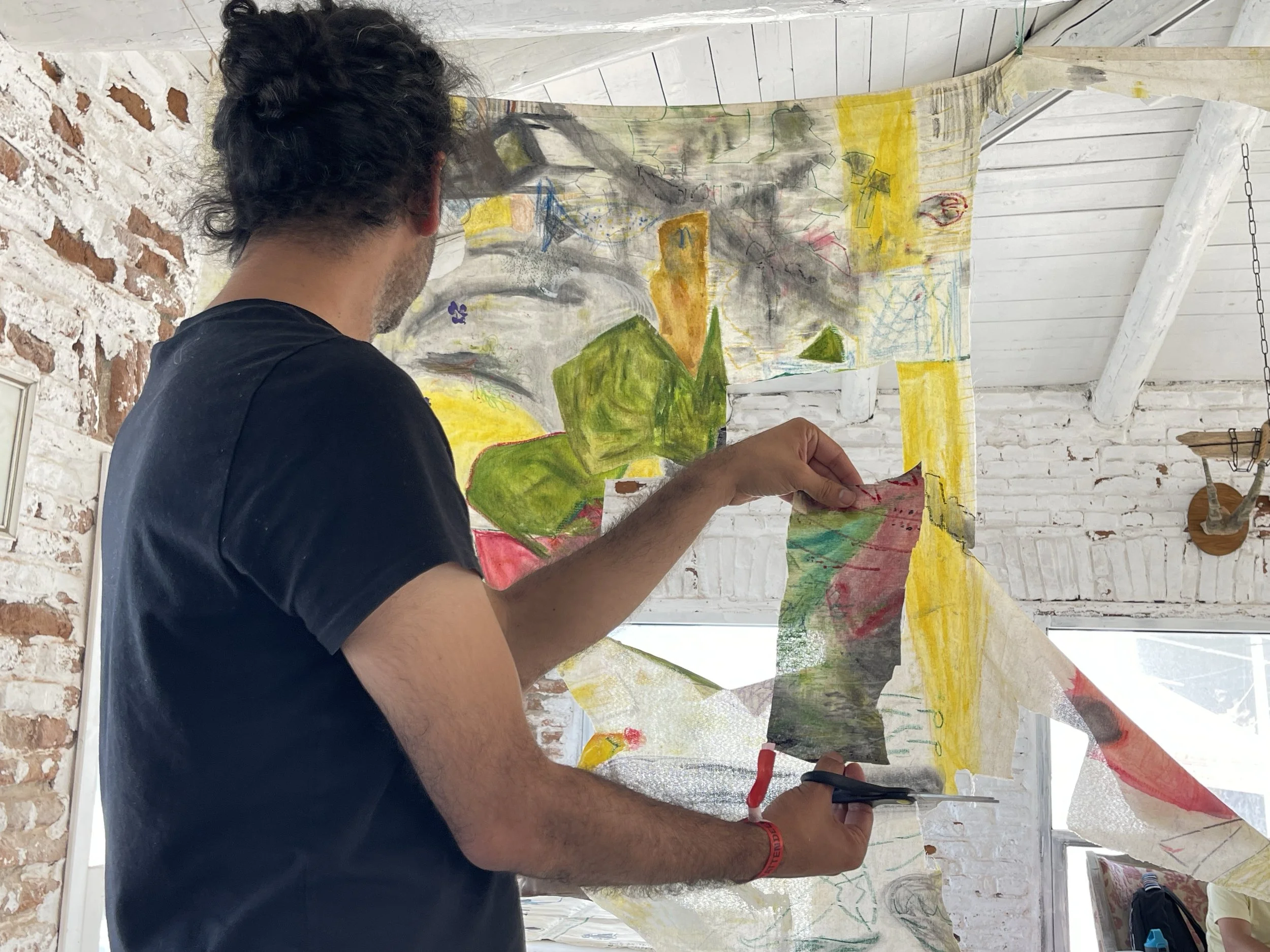 After completing this collective painting practice, we hang the work in a place where everyone can reach it using found objects that are familiar to the eye to create a deeper, more relatable scene, a couch, a dinner table, papers, pens, paints, scissors and more. All of it becomes the installition, the artwork we all worked on together.
